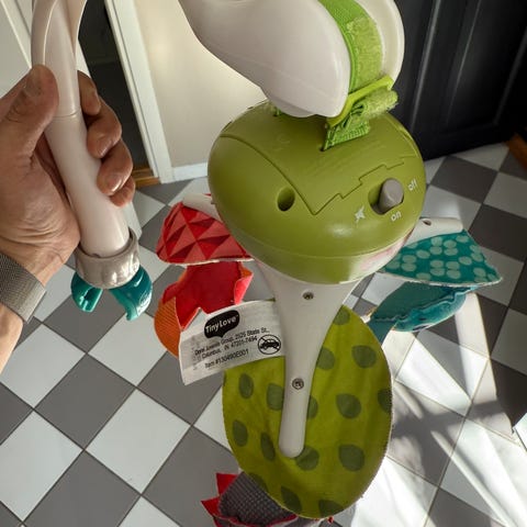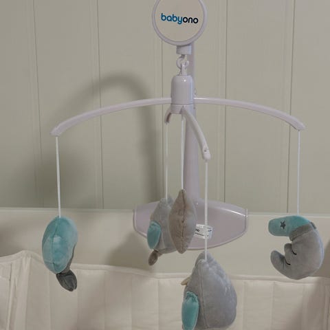 Baby mobil med stjerneformet design, laget av hvitt stoff. Perfekt for å henge over barnesengen for å underholde babyen med sine myke hengende figurer. Passer godt inn i et nøytralt farget barnerom.
