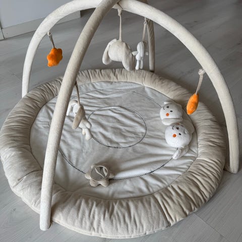 Babygym som er brukt fra februar og til juni. Fikk den i babyshower i desember🤍Følger med original emballasje som en kan se på bilde!