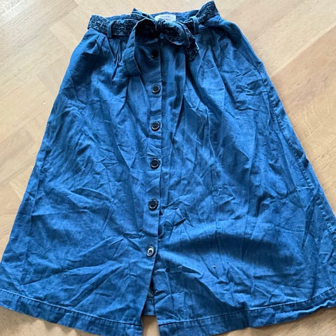Norr skjørt i størrelse S. Fargen er blå, og skjørtet har en klassisk design med belte i midjen. Materialet gir et stilig preg som passer til ulike anledninger. Skjørtet er foret. Bare brukt en gang!