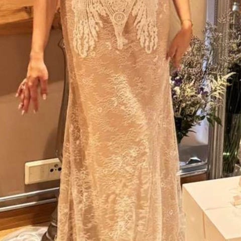 Verdens fineste brudekjole, brukt som kjole nr.2. Den har korsett, lange ermer med masse fine detaljer. Perler, knapper, paljetter og blonder.