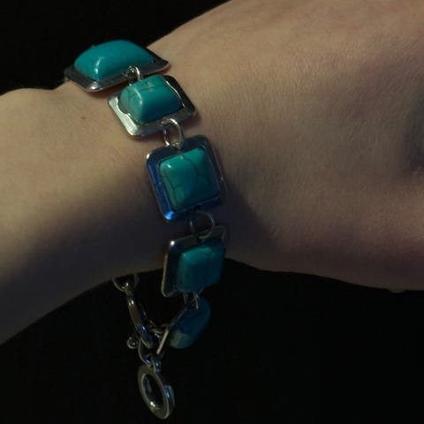 Dette armbåndet er kult til hverdags, men gjør seg til fest, også! Det har noe sommerlig over seg, tenker jeg! Armbåndet er kjøpt i en vintagebutikk i San Francisco. Den åpnes på den ene siden av stenene