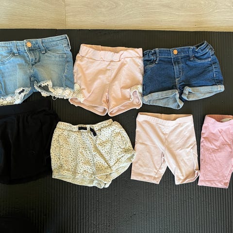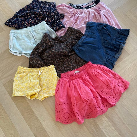 Diverse shorts/ kortbukser/ knebukser/ skjørt selges samlet. Passer str 128. Se bilder for beskrivelse. Kan sendes mot porto.