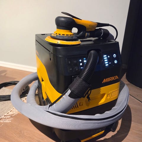 Leier ut komplett Mirka Deros II slipemaskin med tilhørende Mirka støvsuger og slange. Dette er en av de mest avanserte og brukervennlige slipemaskinene på markedet.