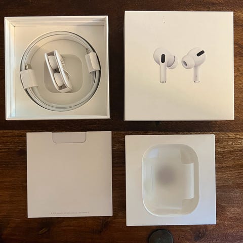 Ingen AirPods følger med – kun eske og kabel som på bildet.