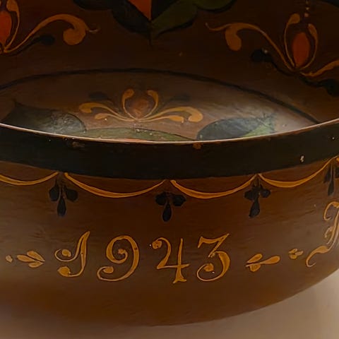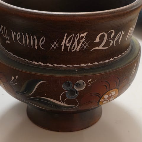 Ølbolle reparert/limt fra 1835. Sprekk vises på bildet- ellers pen. Ca 12 cm i diameter