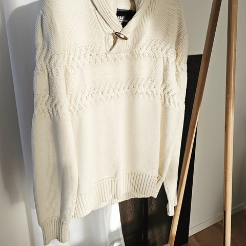 Selger en tykk og varm strikkegenser fra H&M (L.O.G.G.-serien) i størrelse M. Genseren er i en klassisk offwhite farge med flettestrikket mønster og ribbestrikket kant nederst og ved ermene. Passer perfekt til høst og vinter. Lite brukt.