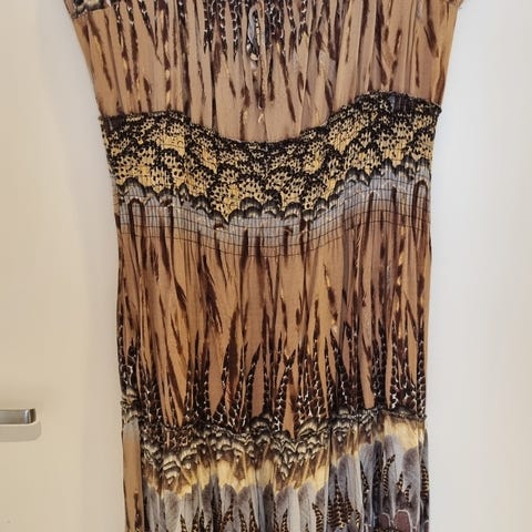 Stripete kjole i gul, hvit og svart. Lett og luftig med smock-strikk i midjen, noe som gjør den veldig elastisk i dette område. Aldri brukt.