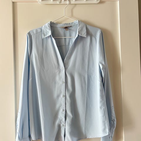 Selger en behagelig lyseblå skjorte fra H&M som er perfekt for jobb eller hverdag 🌟. Skjorten har en myk og lett kvalitet som gjør den veldig komfortabel å ha på hele dagen, samtidig som den gir et pent og profesjonelt uttrykk 👔✨.
