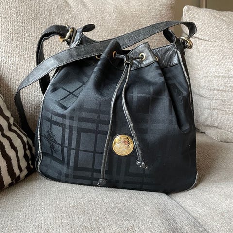 Yttermaterialet er Burberrys’ ikoniske Nova Check-mønster i PVC-belagt canvas med mørke kanter. Innsiden er av imitert skinn.
