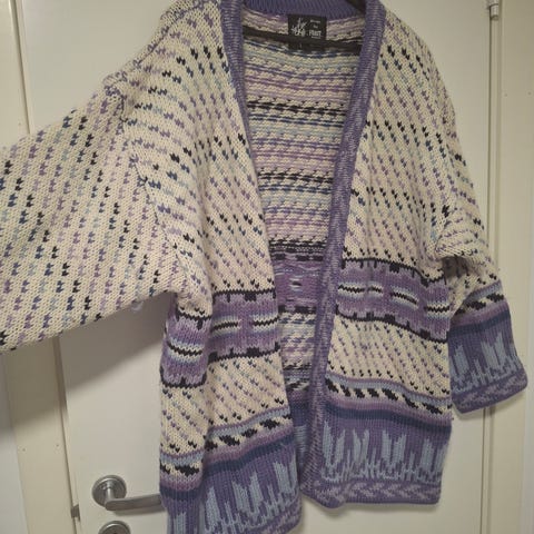 Fin hvit eldre strikket jakke. Ca. 42/44. Pent brukt. God i størrelsen.. Lang på ermene. Så må kanskje brettes opp litt . V - utringet. Knapper i front . Elastisk og fint åpent strikke mønster.. .En del små tråd ut trekk, som er reparert.