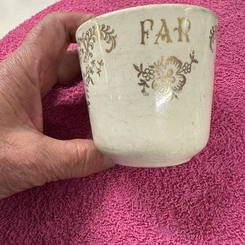 Plettfritt Freiberger Porzellan kaffesett, sannsynligvis fra 1960- eller 1970-tallet. Koppene er dekorert med et julemotiv som inkluderer kristtorn med røde bær og grønne blader, samt kongler.