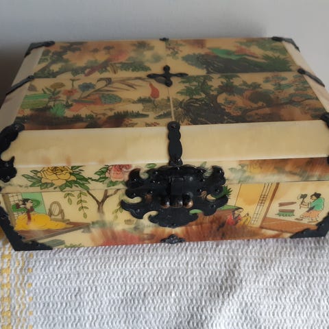 Den er foret med rød silke og er veldig pen også på innsiden. Den mangler en liten pinne til å feste låsen med.