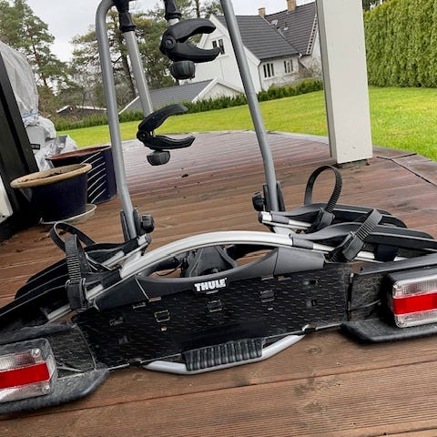 Selger sykkelstativ til 3 sykler , brukt 2 ganger , kjøpt i slutten av mai 2025 . Jeg synes det er litt tungt å vippe den og vanskelig å ta ut / sette den låsesplint som brukes for å kunne vippe stativet . Det må også strammes med pipe på hengerfeste , ikke sånn klikk løsning , selger fordi jeg skal kjøpe til 4 sykler . Låsesplint funker som den skal men kan byttes siden jeg bøyde litt den tynne delen så den er ikke helt perfekt . Nypris 2999kr