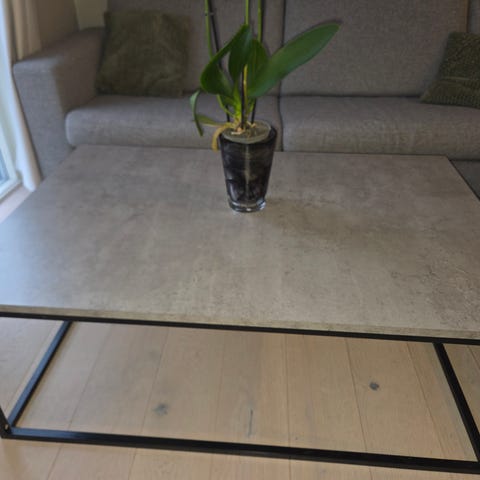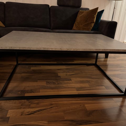Pent salongbord med understell i metall og 5 cm tykk treplate. Tror platen er furu. Noen bruksmerker, men ikke veldig synlig. Bordplaten er behandlet med rubinol hvitolje. Enkelt å pusse og behandle i hvilken farge man ønsker.