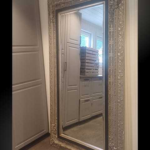 Selger et nydelig speil i klassisk stil med flott, dekorativ ramme i sølvfarge. Speilet gir en elegant touch til soverommet, gangen eller stuen, og fungerer både som et praktisk helfigurspeil og et vakkert interiørelement