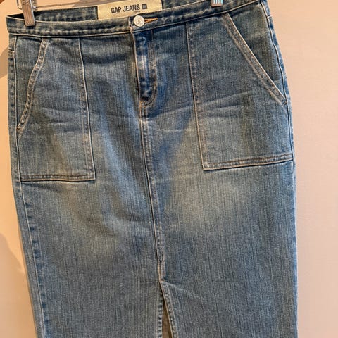 Gap kids skjørt str 140/ L regular, men jeg synes det passer like godt til voksen str M og L. Lyseblått, litt denimaktig stoff med hvite broderier på. 100 % bomull.