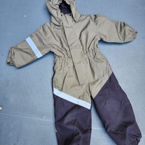 Ingen slitasje bortsett fra litt slitte strikker under føttene. Turkis dress fra Stormberg, tynn, vanntett og perfekt i høstværet. Noen flekker, se bilde. Mulig de går vekk med flekkfjerner.
