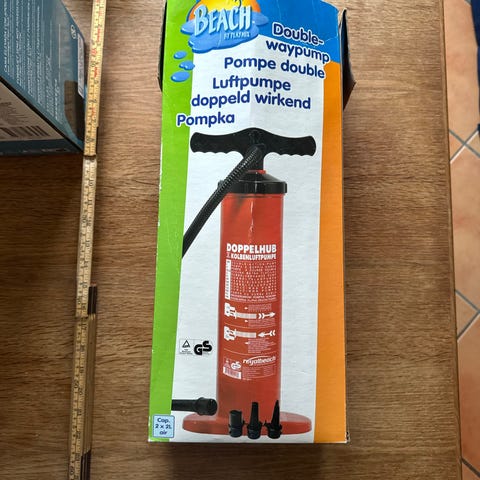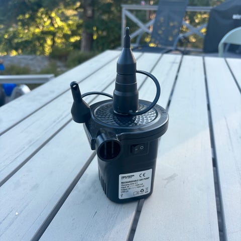 Elektrisk luftpumpe i rød farge. Inkluderer flere munnstykker for ulike bruksområder. Egnet for oppblåsing av madrasser, leker og andre oppblåsbare produkter.