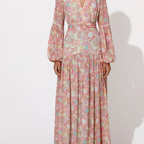 Kjolen er rosa med små blomster, perfekt for spesielt for festlige anledninger. Den har lange ermer og et elegant snitt som gir et sofistikert uttrykk.