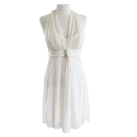 Speechless kjole i blå farge, størrelse XS. Kjolen har blonder på overdelen og en dekorativ midjebånd med perler og steiner. Materialet er en kombinasjon av chiffon og blonde, egnet for formelle anledninger.