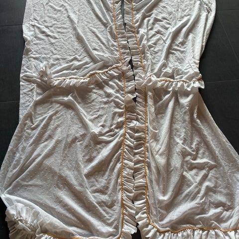 Gardiner i velour. Gylden farge. 3 lengder. Totalt er alle lengdene 210cm lange, men to av de er 197 cm lange med oppbrett på 13 cm. Siste lengde er 220 cm uten oppbrett. Alle har rysjebånd. Kr 150 pr lengde.