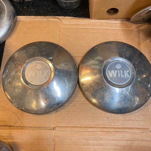 To fine hjulkapsler til gammel campingvogn, mest antakelig en 1970 modell Thomson
