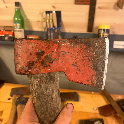 Svært fin øks med dølanakke. Muligens mustad. Noe overflaterust, men ingenting av betydning. godt skaft. Leveres nyslipt.