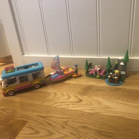 Lego friends campingvogn med tilbehør og bruksanvisning.