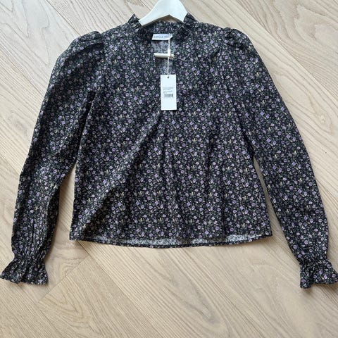 Minni Blouse i dus rosa fra Camilla Pihl. Blusen har korte puffermer med volangkant og knappelukking i front med perlemorsknapper og en rett passform.
