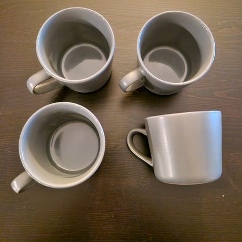 Høyde 9cm, diameter oppe 13cm. 1 hvit og 1 blå kopp.