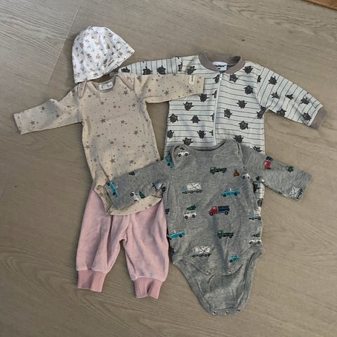 Klespakke til baby, størrelse 56–62. Totalt 18 plagg fra merker som Newbie, H&M, Hust & Claire, Reflex, osv. Klærne er i god stand, pent brukt og klare for ny runde. Perfekt for babyens neste størrelse.