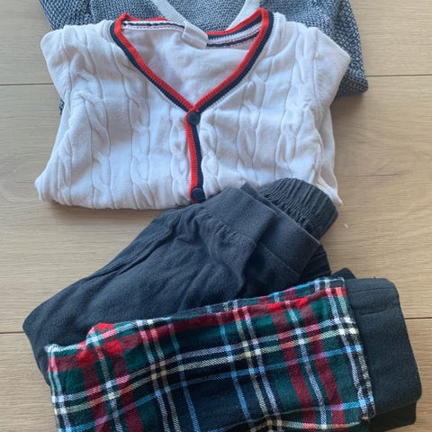 Klespakke med dressbukse, skjorte, to gensere og fire boxere selges samlet til 100kr.