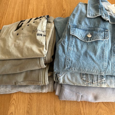 Str 10-12 år 1 stk genser lang arm kr 40,-. 2 stk gensere m/kort arm kr 30,-. Trøye kr 20,- og shorts kr 30,-. Alt meget pent.