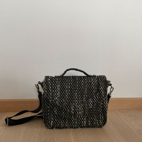 Denne vesken er heklet, er lys sage grønn og har målene: