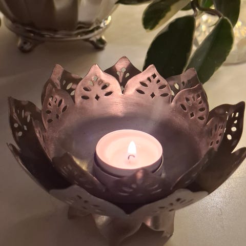 Stilig lykt i gullfarget metall. Det perforerte mønsteret gir et vakkert lysspill når lyset er tent. Passer til telys og små kubbelys. Dekorativ alene, eller i kombinasjon med den mindre varianten (den i mindre størrelse er inkludert).