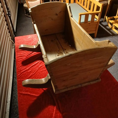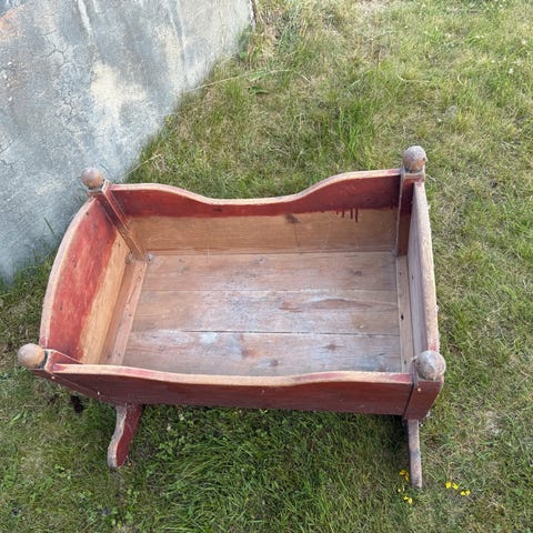 Original blå maling. Tverrgående meier. Malte eierinitialer og datering BMT 1881. Vuggen er trolig 20-30 år eldre enn dateringen. Høyde 52 cm. Bredde 43/84 cm. Lengde 84 cm. Ingen skader.