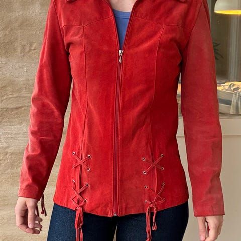 «Den perfekte» skinnjakka i semsket beige skinn. Ser ikke str. men selges fordi den dessverre er for liten til meg - og jeg bruker str M. Vil si den passer en S eller XS, hvis du liker den romslig. Både skinnet utenpå og foret inni er i veldig fin stand.