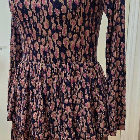 Utrolig myk og behagelig kjole, eier vokste ut av kjolen før den ble tatt i bruk. Kun fjernet lapp og ligget i skapet. Den har volanger nederst på ermer. Fastsydd volanger fra livet og ned på skrått, slik at det ser ut som en omslagskjole. Kjolen har ingen glidelås eller snorer. Den er lett og luftig å ha på, oppleves som normal i størrelsen.