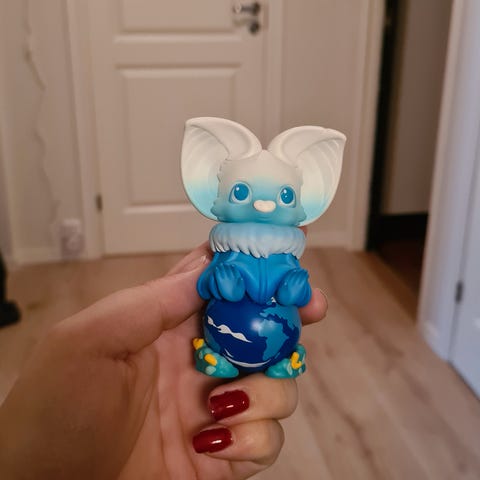Selger en Yoki blind box figur fra Pop Mart. Denne er fra kolleksjonen Gemstone Prince, og denne figuren heter "Sapphire".