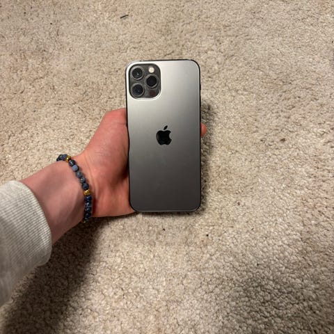 Selger en iPhone 12 pro i gull, telefonen har en knust bakskjerm og en front skjerm som har noen svake touch punkter til høyere på skjermen.