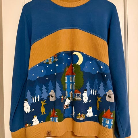 Nydelig Mummitrollet genser, unik i duse farger. Det er en genser med mummitrollet figurer på. Størrelse S men stor og god lengde. Nydelig mønster. For henting i Hamar eller sendes mot et frakttillegg. Myk og behagelig, lange ermer.