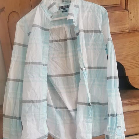Nydelig kort grå og hvitrutete Maria Westerlind skjorte. Den er vid, korte ermer, meget pent brukt. Kan brukes til skjorter, bukser, fest og hverdags. For henting i Oslo eller sendes mot et frakttillegg.