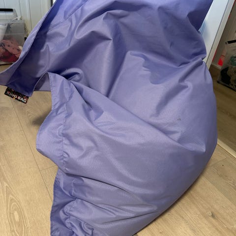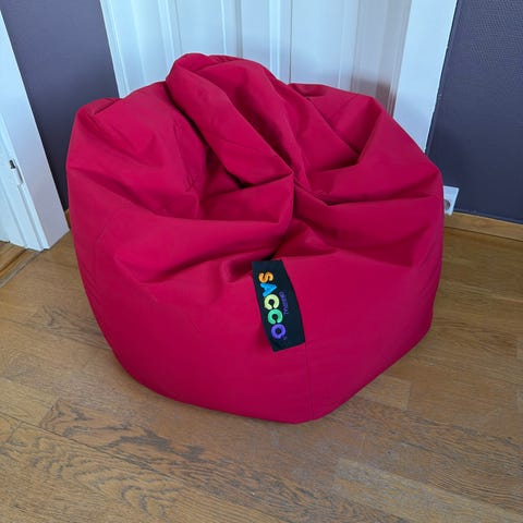 Liten Sacco sekk, har vært veldig populær å se barne-TV i. Den har noen flekker og selges derfor veldig billig. Den har glidelås så man kan ta ut (og evt også etterfylle) isopor-perler og vaske trekket. Flekkene ser ut som sjokolade så jeg tror de går av med litt vanish. De er ikke veldig godt synlige.