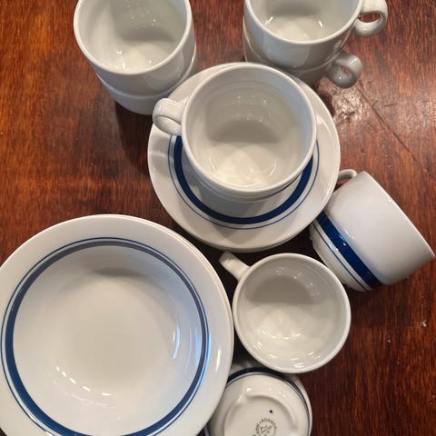 Gammelt servise med 8 stk kopper, 11 stk kakefat/frokostfat og 12 stk tefat.