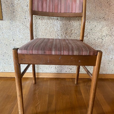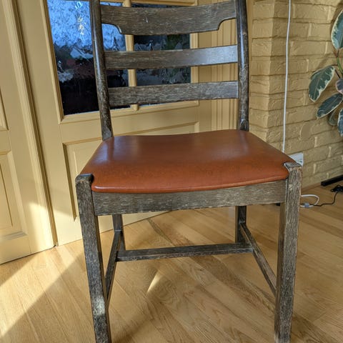 Jeg prøvde faktisk å slå ihjel denne en gang, da den befant seg i en container med sårt behov for bedre plass, men da det viste seg at stolen er laget av en tresort med tilnærmet samme egenskaper som titan, ble den med meg hjem istedet for å ende sine dager i forbrenningsanlegget. "Garantert" laget av et eller annet sikkert allerede utryddet regnskogstømmer med andre ord. Til alt overmål dukket det opp ei seteplate som noen har begynt å fikse, som selvsagt ikke passer, men som noen kanskje kan/vil få til å passe? Eventuelt er det alltids mulig å finne/lage noe som passer..?