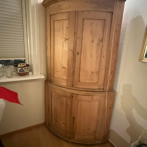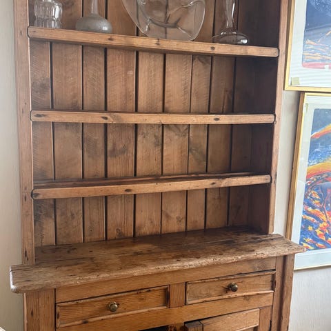 * Type møbel: Et stort, rustikk skap eller skjenk (2 deler) i furu. Det har en åpen overdel med mange hyller og en lukket underdel med dører. Hengslene er slitte, men fungerer.