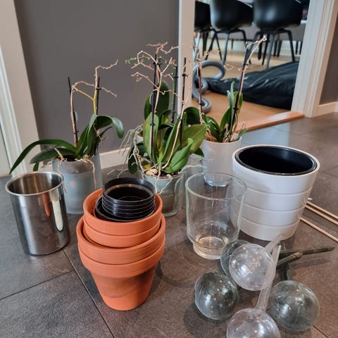 Tre veggampler selges for kr 150.- En fjerde kan fås med på kjøpet. Denne har en liten sprekk. Plass til blomst med vanlig pottestørrelse. Flott blåfarge. Har også en stor beige potte. Diameter 21 cm. Høyde vel 25 cm. Denne kan du få med på kjøpet. Sender ikke disse!