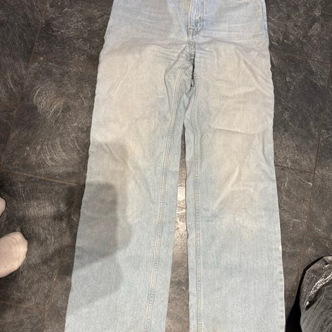 Dongeribukse med vide bein, naturlige hullete knær, lyse blå på farge.