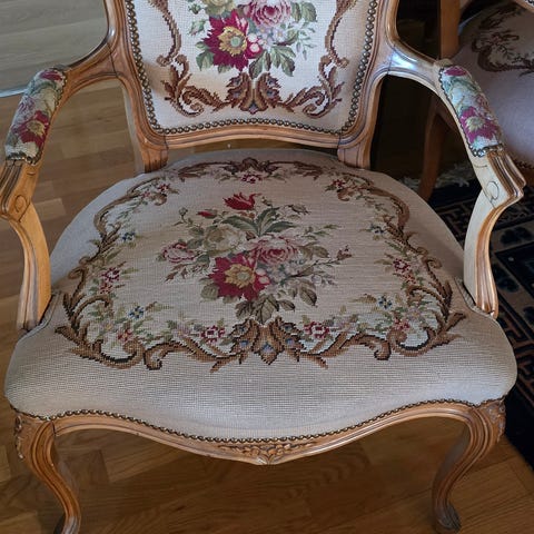 Antikk bue stol med håndbrodert trekk. Fløyel trekk i rygg / baksiden . Høyde 91 cm, sitte høyde ca 30 cm