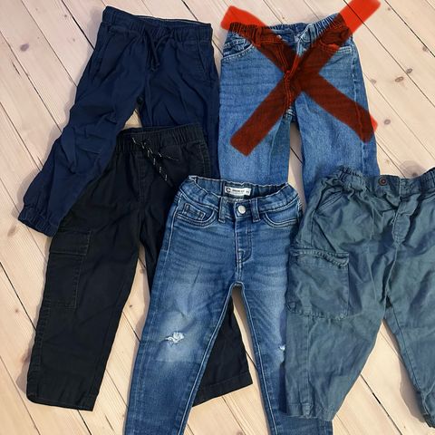 Pent brukte bukser i størrelse 92-98. Tilsvarer ca samme størrelse og er brukt på samme tid. Merker som hm, polarn og pyret, noa noa miniature, garcia. Buksen fra noa noa miniature har litt slitasje på kne.